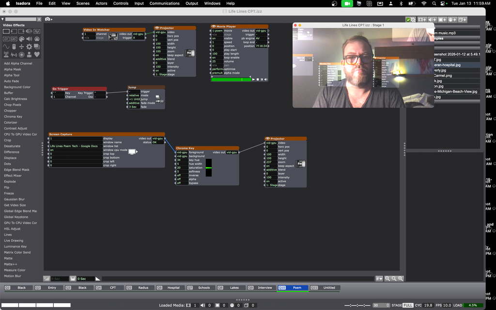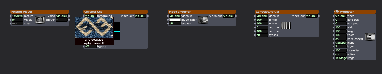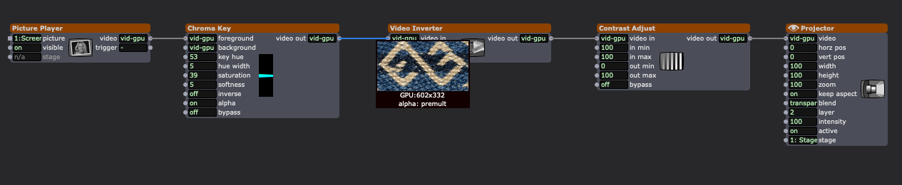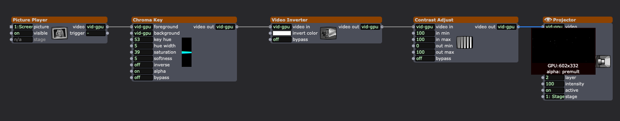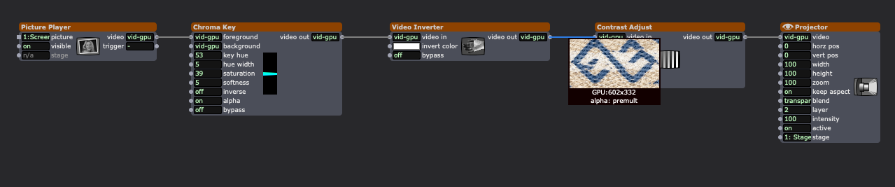 - The top chain of actors has the Projector set to 'layer' = 1', 'blend' = 'transparent', and 'intensity' = '100' so we can see this video content.