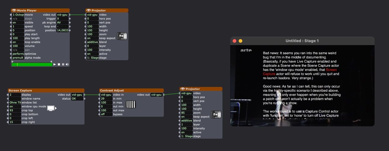 I have added a "contrast adjust" actor because the TextEditor background appears not totally black in Isadora.