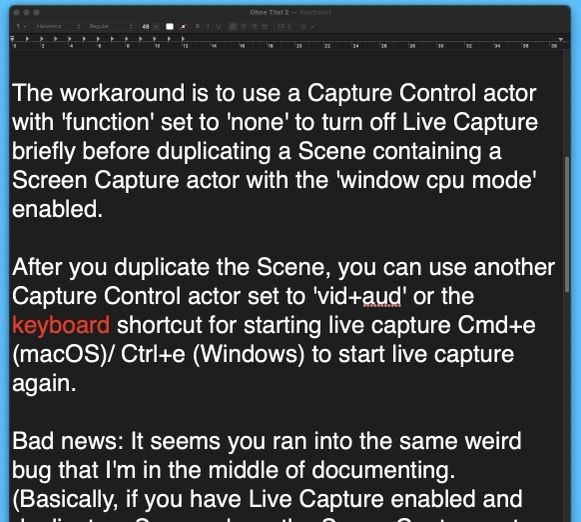 The workaround is to use a Capture Control actor with 'function' set to 'none' to turn off Live Capture briefly before duplicating a Scene containing a Screen Capture actor with the 'window cpu mode' enabled.