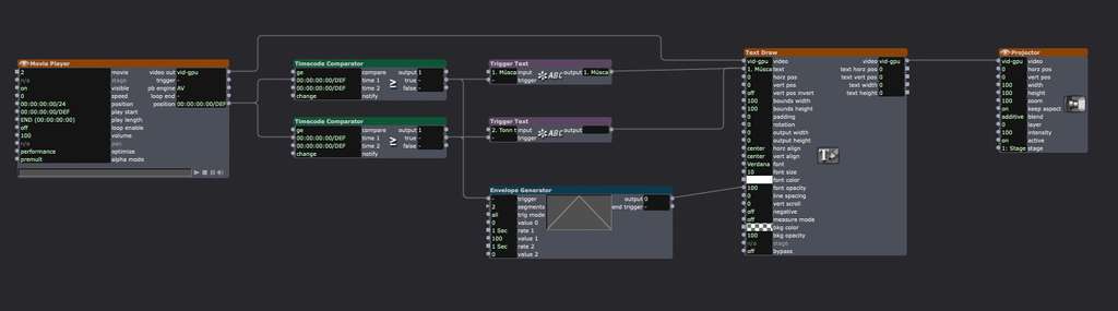 For this second part, I am using a timecode comparator and triggering a user actor to snap in/fade out a projector intensity for the required text as a lower third. The logic of this seems to work and it is fine per single utterance of the TC & user actor here