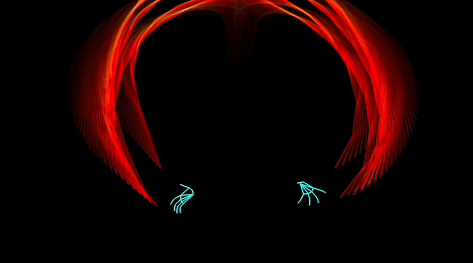 Thanks for sharing. Love to see what artists are doing with Isadora features. Like you, I have had a lot of fun with MediaPipe in Isadora. It is remarkable how accurate and stable the tracking is and it is not too bad at dealing with occlusion issues. My next step is using a thermal or infrared camera system so that the interactivity makes sense in a blackbox/low light performance setting. MediaPipe is really effective with available light cameras as long as there is lots of light - I am looking for a solution for this that works with theatrical/performance lighting that is a lot more subtle. My debut performance with this tracking was a 'cats cradle' game. During intermissions members of the audience at an outdoor film festival could play with virtual strings between their fingers while the Isadora stage was projected onto a giant mango tree next to a large cinema screen. The low latency and accuracy made for a fun audience experience. My only issue was having to light the participant enough to get good tracking and then this lighting interfering with the participant observing the projection - for the onlookers it worked really well. Projection always seems to work better when you can mitigate control and limit other light sources.  This screengrab matches Pythoner MediaPipe with Isadora's 3D Ropes actor module and a Motion Blur. I really appreciate the output effect of this with the physics of the 3D Ropes creating a very responsive live dynamic.