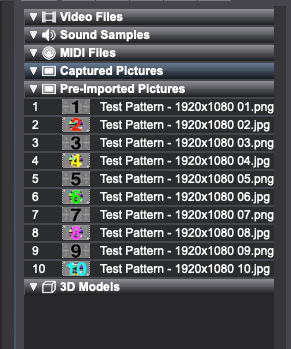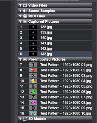 Here I've added a second picture bin ("Pre-Imported Pictures") and imported whatever 'canned' pictures I intend to use into it. Notice the empty picture bin above it in the Media View named "Captured Pictures".