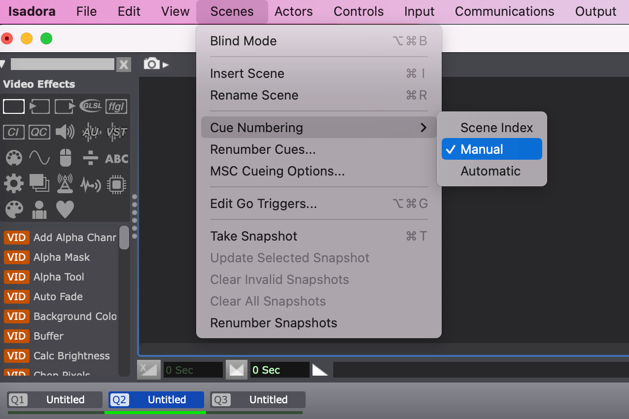 I used a Current Scene Number actor and then I used a calculator to add 1 to that number into a text formatter to take the number and make it text and then used the Jump to Cue actor to go to the next Scene. This broke during Tech today, becasue even though in pre-pro we talked about not having point cues and just using the Scene index, he has pivoted to wanting the cue numbers to, if not match, at least be in the same range as the LX q numbers.