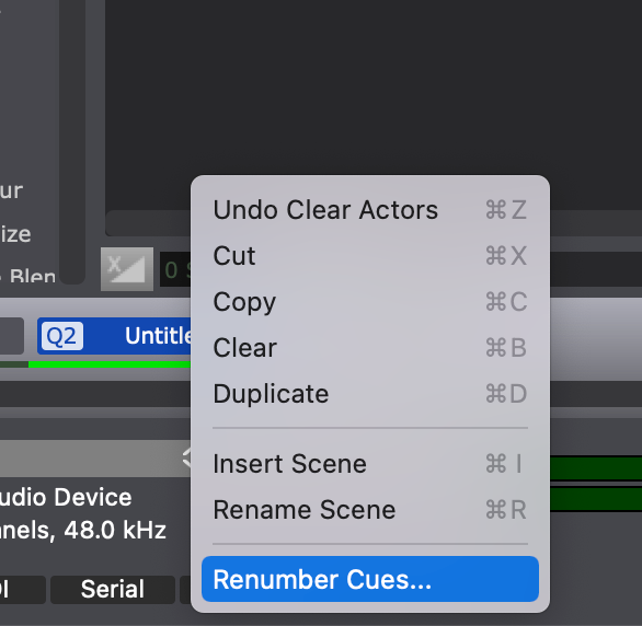 Select one or more Scenes in the Scene List, right-click, then select the bottom option ("Renumber Cues...")