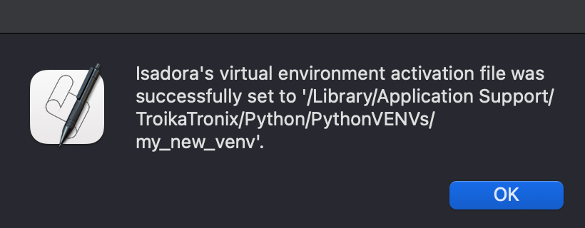 I created a virtual environment using the provided Apple script and the script to activate it. However, Isadora says "Awaiting Activation". I attached the screenshot for the view in Isadora as well as the current ActiveVirtualEnvironmentPath.txt file. Am I missing a setup step?