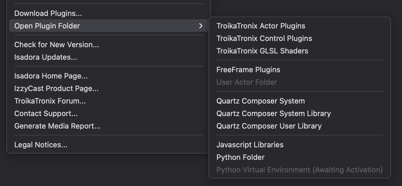 I assume you have watched these tutorials: Using the Pythoner Actor – Do More in Isadora with Python - YouTubeNOTE: Python is not initialized in Isadora until a Pythoner actor is added to the project. You can update the 'environment activation file' and restart Isadora, and the Python Virtual Environment setting under the Help menu will appear GRAYED OUT & (Awaiting Activation) until the Pythoner actor is added to the project.