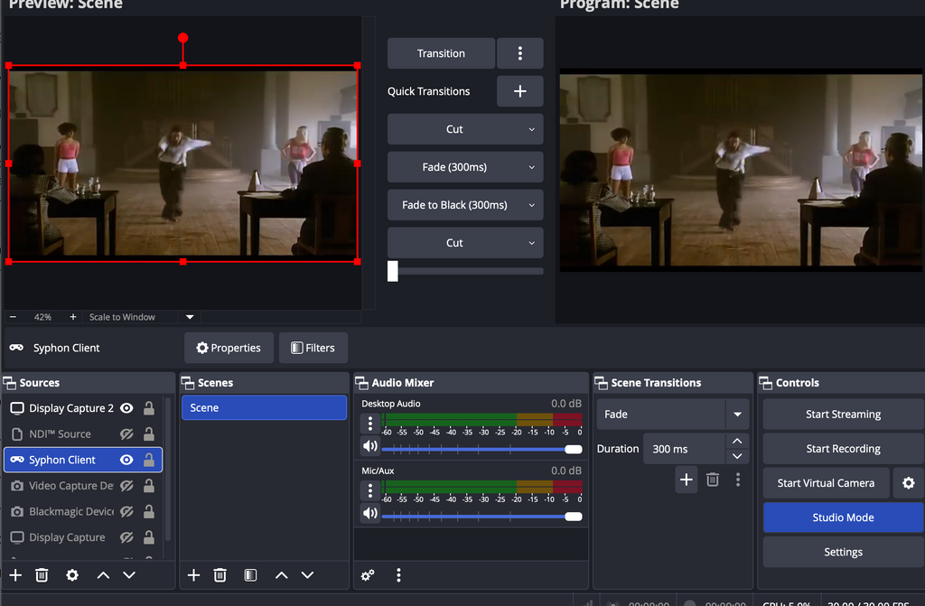 Your syphon feed should appear in the left hand preview window. Use CUT or the slider to bring the preview into the output pane.