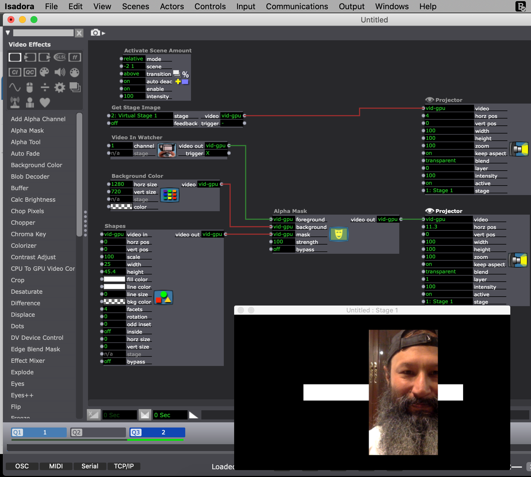 Hi! You can send the video to a virtual stage in the secondary scene you want to activate. In the active main scene, you can use the "Get Stage Image" actor, and this way you can send the video to a Projector Actor using layers. This way, alpha transparency is preserved, and you can arrange the layers as you like.